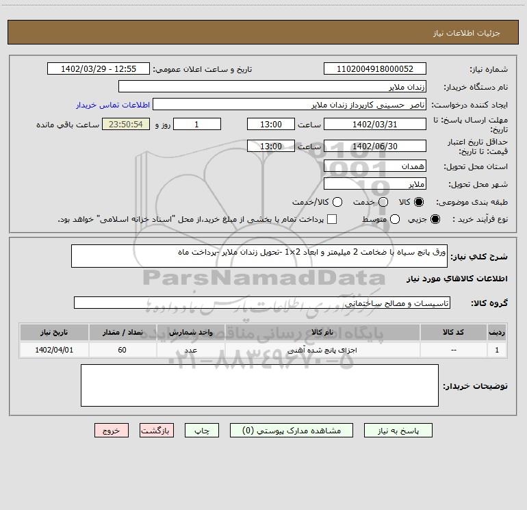شرح کلی نیاز: ورق پانچ سیاه با ضخامت 2 میلیمتر و ابعاد 2×1 -تحویل زندان ملایر -پرداخت ماه