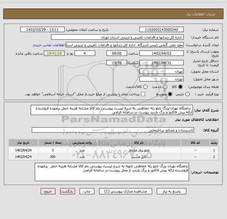 شرح کلی نیاز: ندامتگاه تهران بزرگ تابلو رله حفاظتی به شرح لیست پیوستی نام کالا مشابه هزینه حمل برعهده فروشنده ارائه پیش فاکتور و برگ بازدید پیوست در سامانه الزامی