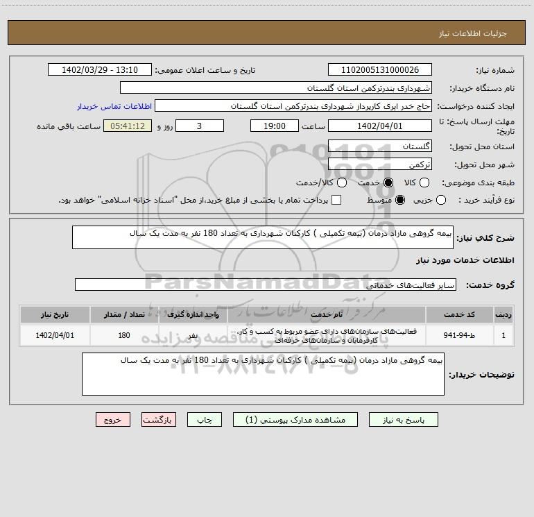 شرح کلی نیاز: بیمه گروهی مازاد درمان (بیمه تکمیلی ) کارکنان شهرداری به تعداد 180 نفر به مدت یک سال