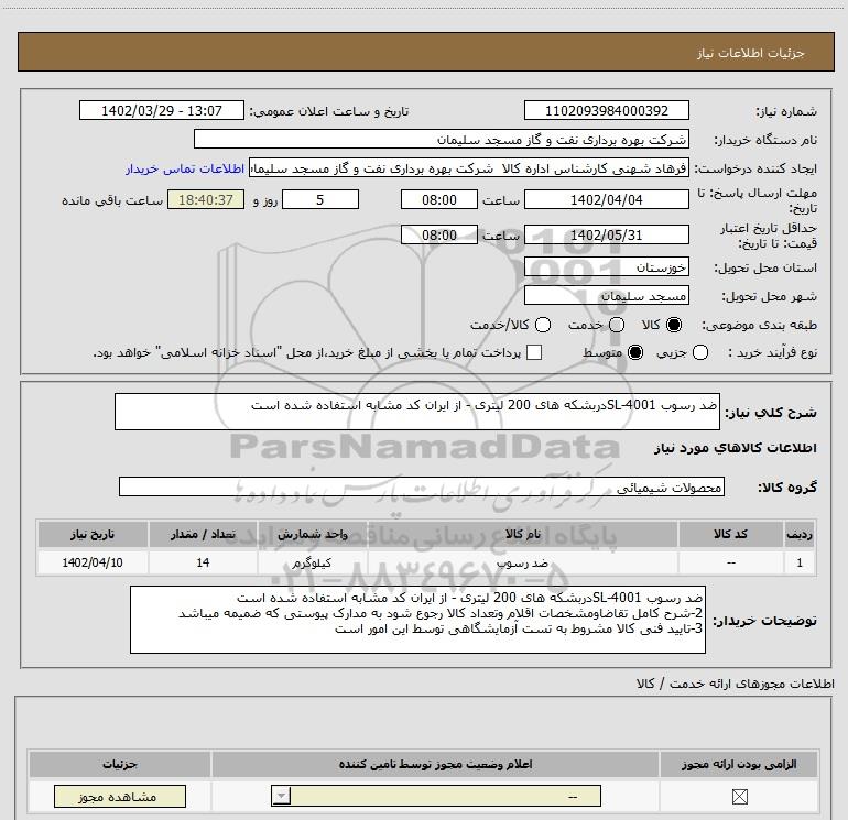 شرح کلی نیاز: ضد رسوب SL-4001دربشکه های 200 لیتری - از ایران کد مشابه استفاده شده است