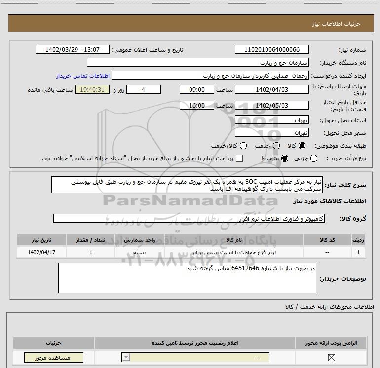 شرح کلی نیاز: نیاز به مرکز عملیات امنیت SOC به همراه یک نفر نیروی مقیم در سازمان حج و زیارت طبق فایل پیوستی