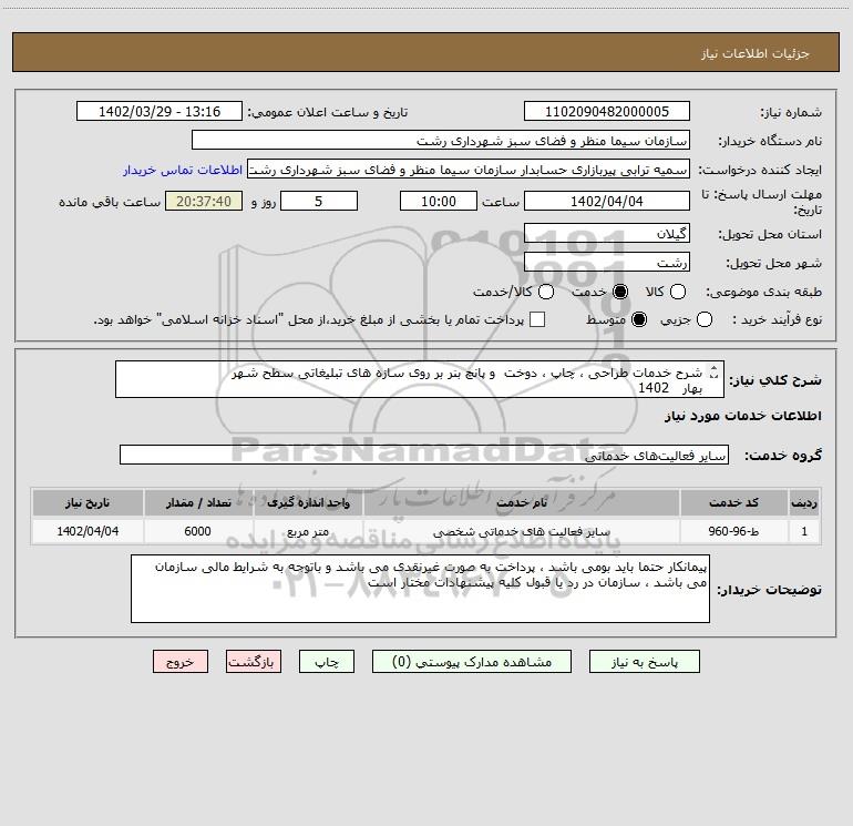 شرح کلی نیاز: شرح خدمات طراحی ، چاپ ، دوخت و پانچ بنر بر روی سازه های تبلیغاتی سطح شهر بهار 1402