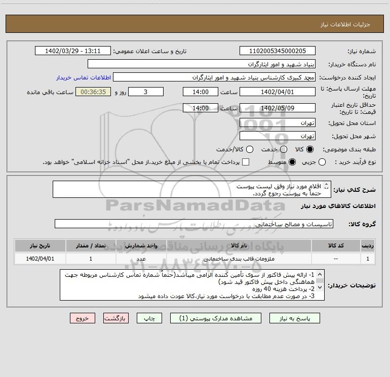نام دستگاه خریدار:بنیاد شهید و امور ایثارگران