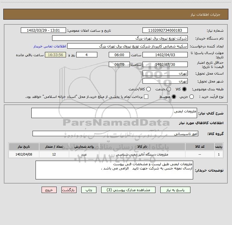 توضیحات خریدار:ملزومات ایمنی طبق لیست و مشخصات فنی پیوست ارسال نمونه جنس به شرکت جهت تایید الزامی می باشد .