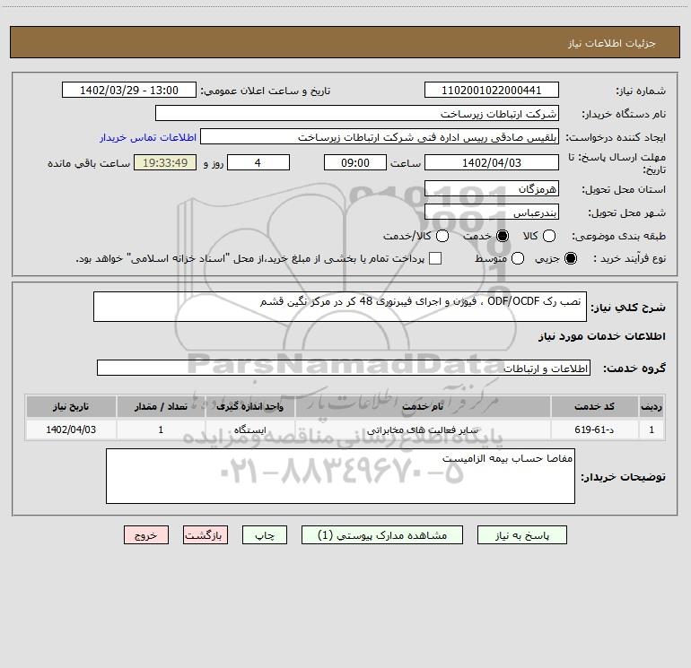 شرح کلی نیاز: نصب رک ODF/OCDF ، فیوژن و اجرای فیبرنوری 48 کر در مرکز نگین قشم