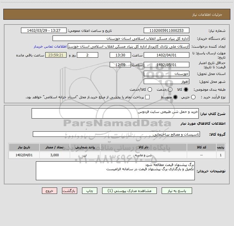 شرح کلی نیاز: خرید و حمل شن طبیعی سایت فردوس