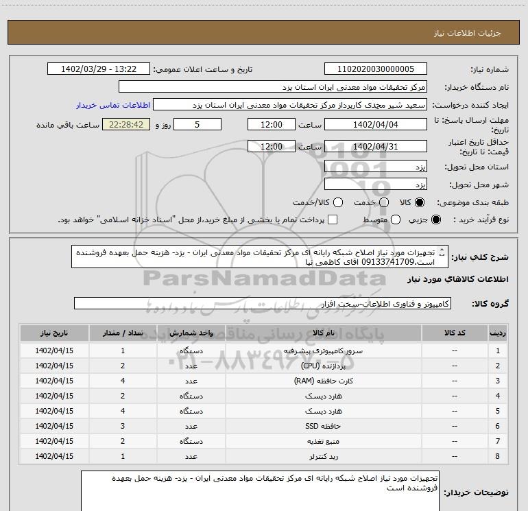 شرح کلی نیاز: تجهیزات مورد نیاز اصلاح شبکه رایانه ای مرکز تحقیقات مواد معدنی ایران - یزد- هزینه حمل بعهده فروشنده است.09133741709 اقای کاظمی نیا