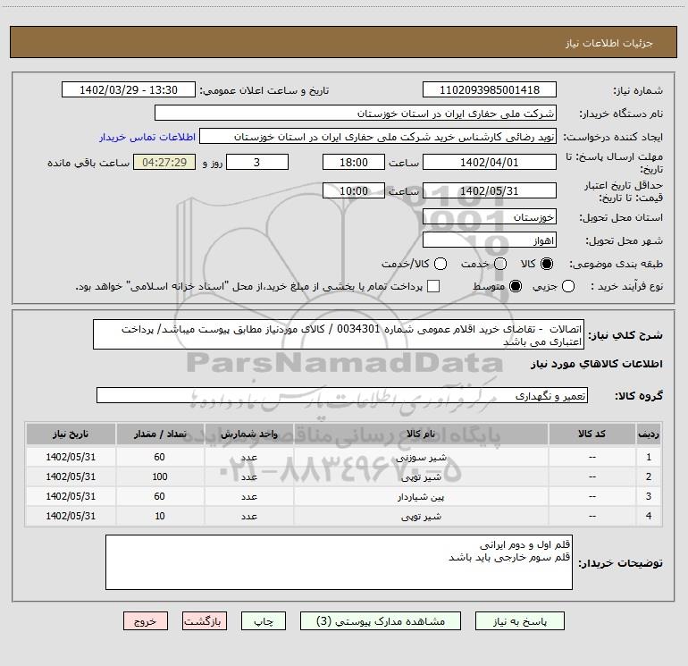 استعلام اتصالات - تقاضای خرید اقلام عمومی شماره 0034301 / کالای موردنیاز مطابق پیوست میباشد/ پرداخت اعتباری می باشد, استعلام اتصالات - تقاضای خرید اقلام عمومی شماره 0034301 / کالای موردنیاز مطابق پیوست میباشد/ پرداخت اعتباری می باشد