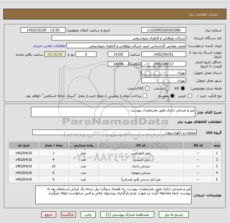 شرح کلی نیاز: میز و صندلی اداری طبق مشخصات پیوست ،