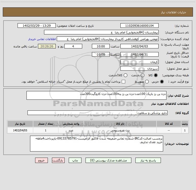 شرح کلی نیاز: درن پن رز باریک 100عدد-درن پن رز پنه100عدد-درن کاروگیت300عدد