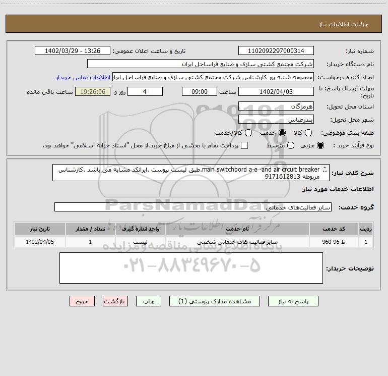 شرح کلی نیاز: main switchbord a-e -and air crcuit breaker.طبق لیست پیوست .ایرانکد مشابه می باشد .کارشناس مربوطه 9171612813