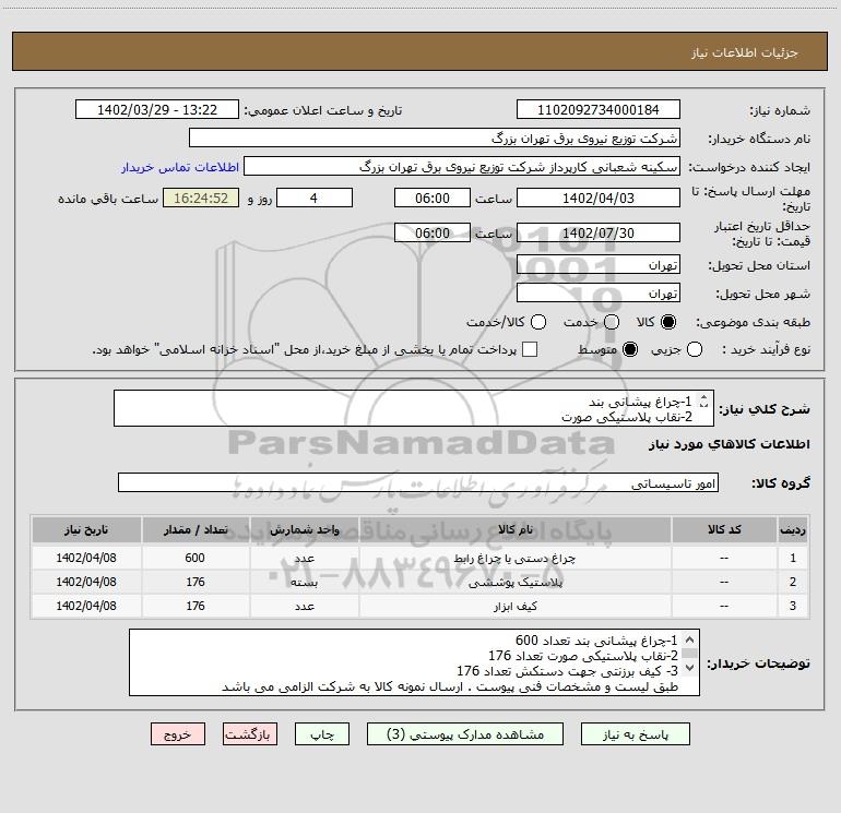 توضیحات خریدار:1-چراغ پیشانی بند تعداد 600 2-نقاب پلاستیکی صورت تعداد 176 3- کیف برزنتی جهت دستکش تعداد 176 طبق لیست و مشخصات فنی پیوست . ارسال نمونه کالا به شرکت الزامی می باشد
