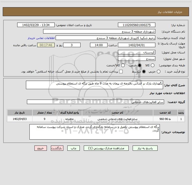 شرح کلی نیاز: نگهداری پارک بر اساس دفترچه ی پیمان به مدت 9 ماه طبق برگه ی استعلام پیوستی