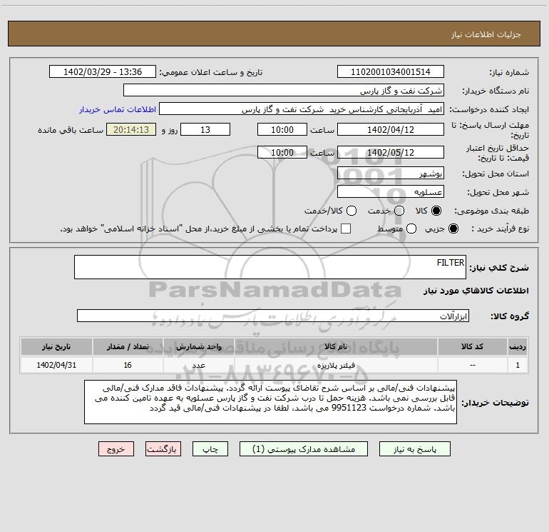 توضیحات خریدار:پیشنهادات فنی/مالی بر اساس شرح تقاضای پیوست ارائه گردد. پیشنهادات فاقد مدارک فنی/مالی قابل بررسی نمی باشد. هزینه حمل تا درب شرکت نفت و گاز پارس عسلویه به عهده تامین کننده می باشد. شماره درخواست 9951123 می باشد، لطفا در پیشنهادات فنی/مالی قید گردد
