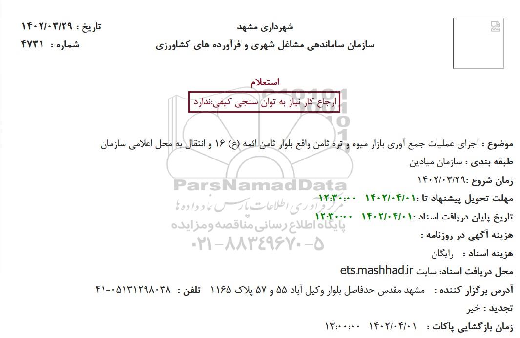 استعلام بها و موضوع استعلام استعلام اجرای عملیات جمع آوری بازار میوه و تره ثامن به اطلاع کلیه شرکتها و افراد متخصص واجد شرایط میرساند، آگهی گذار در نظر دارد از طریق استعلام بها، نسبت به انتخاب و دریافت پیشنهادات اقدام نماید. این استعلام با کد آگهی ثبت شده در سامانه خبرگزاری پارس نماد : 5976002 منتشر شده است. مشخصات استعلام : تاریخ شروع استعلام: 1402/03/29 آخرین مهلت ارسال پیشنهاد قیمت : 1402/04/01 و محل اجرای پروژه : استان خراسان رضوی میباشد. استعلام قیمت مورد درخواست : استعلام اجرای عملیات جمع آوری بازار میوه و تره ثامن با دستهبندیهای تخصصی و گروه های مرتبط : ساختمان, استعلام اطلاع رسانی میگردد.