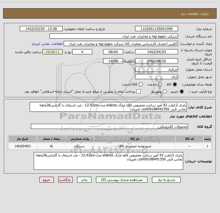 شرح کلی نیاز: یاتری 12ولت 42 آمپر ساعت مخصوص ups مارک solarex مدل-12.42pe - ضد اشتعال با گارانتی36ماهه تماس فنی 09188491350آقای امیریان