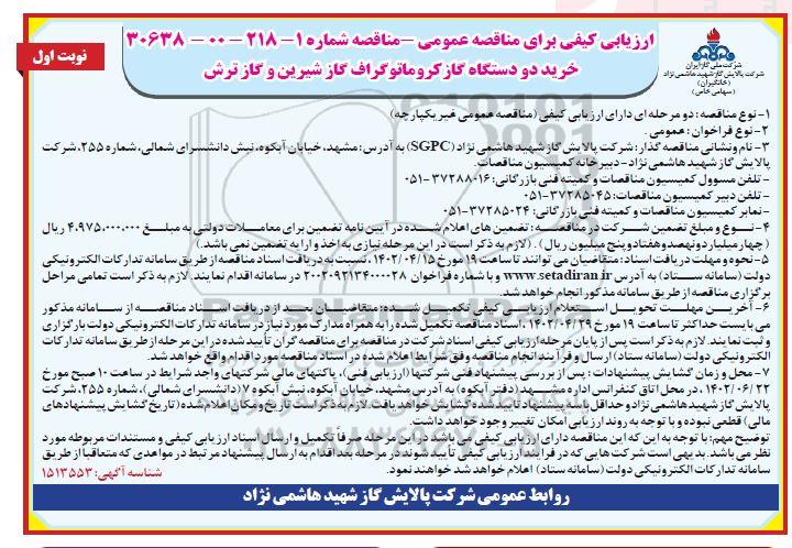 ارزیابی کیفی مناقصه خرید دو دستگاه گاز کروماتوگراف گاز شیرین و گاز ترش از کلیه افراد متخصص و شرکت‌ها واجد شرایط دعوت به عمل می‌آید در مناقصه با کد خبرگزاری پارس نماد: 5976017 شرکت نمایند. این مناقصه در تاریخ 1402/03/29 شروع و مهلت آن تا تاریخ 1402/04/15 میباشد.