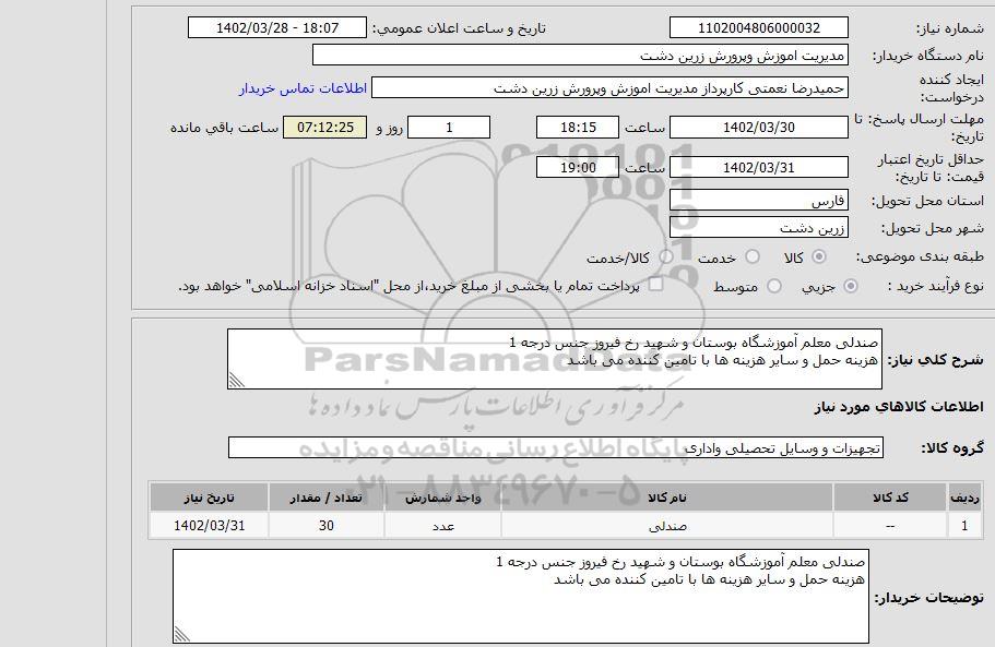 شرح کلی نیاز: صندلی معلم آموزشگاه بوستان و شهید رخ فیروز جنس درجه 1 هزینه حمل و سایر هزینه ها با تامین کننده می باشد