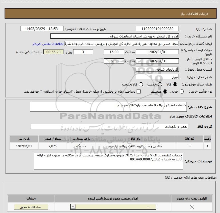 شرح کلی نیاز: خدمات تنظیفی برای 9 ماه به متراژ7875 مترمربع