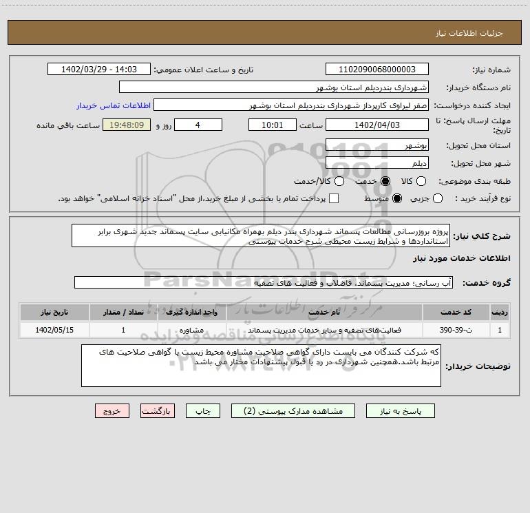 شرح کلی نیاز: پروژه بروزرسانی مطالعات پسماند شهرداری بندر دیلم بهمراه مکانیابی سایت پسماند جدید شهری برابر استانداردها و شرایط زیست محیطی شرح خدمات پیوستی