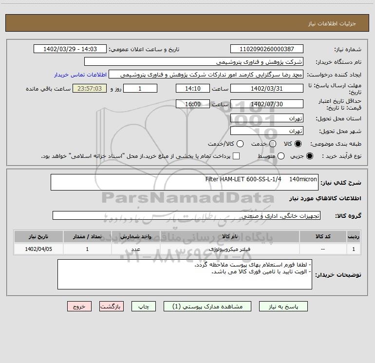 نام دستگاه خریدار:شرکت پژوهش و فناوری پتروشیمی