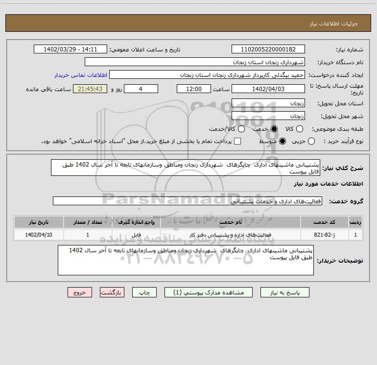 شرح کلی نیاز: پشتیبانی ماشینهای اداری چاپگرهای شهرداری زنجان ومناطق وسازمانهای تابعه تا آخر سال 1402 طبق فایل پیوست