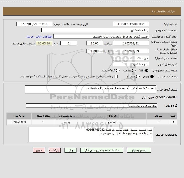 شرح کلی نیاز: تخم مرغ شوید خشک آب میوه مواد غذایی زندان ماهشهر