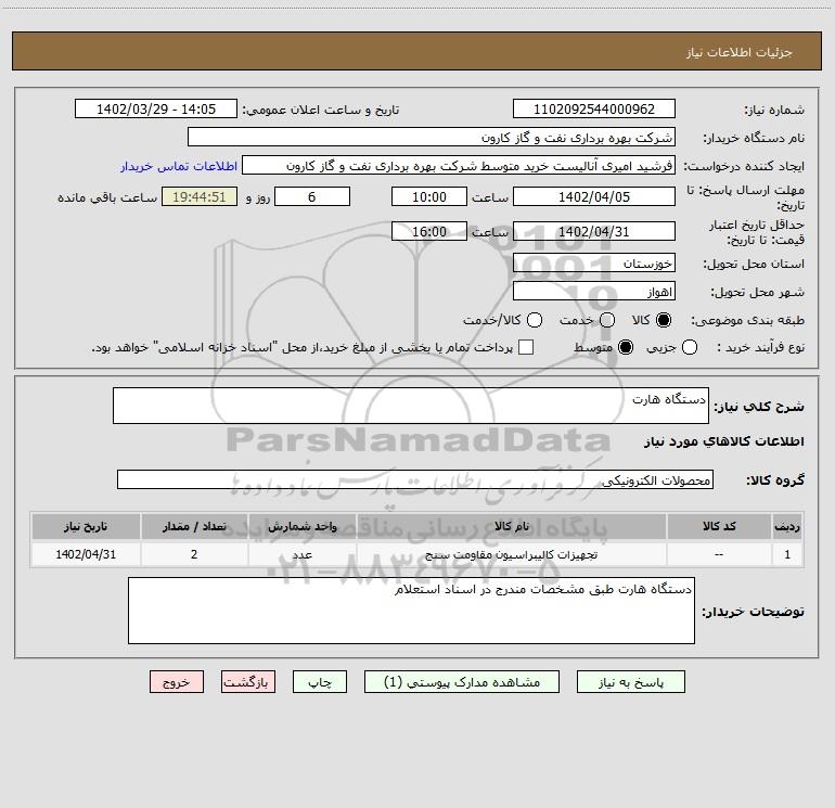 توضیحات خریدار: دستگاه هارت طبق مشخصات مندرج در اسناد استعلام