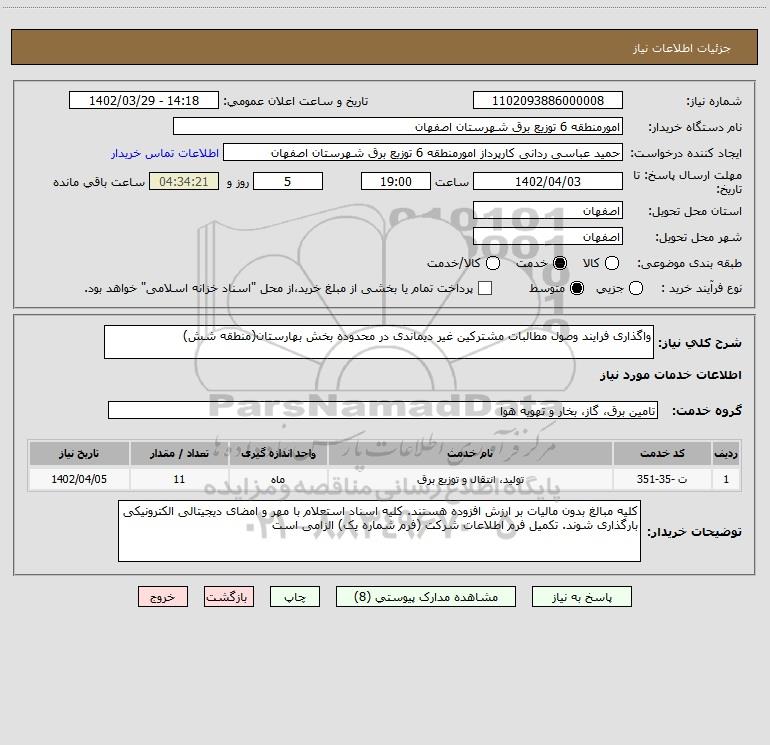 شرح کلی نیاز: واگذاری فرایند وصول مطالبات مشترکین غیر دیماندی در محدوده بخش بهارستان(منطقه شش)