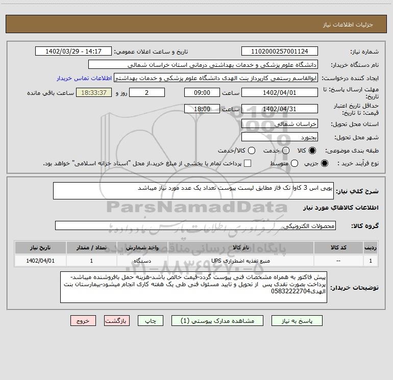 شرح کلی نیاز: یوپی اس 3 کاوا تک فاز مطابق لیست پیوست تعداد یک عدد مورد نیاز میباشد