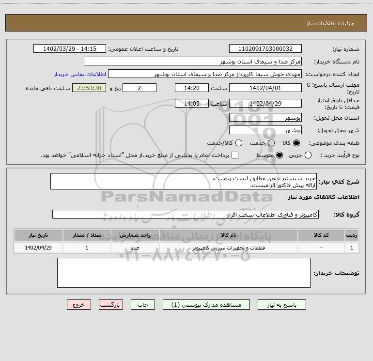 شرح کلی نیاز: خرید سیستم تدوین مطابق لیست پیوست.