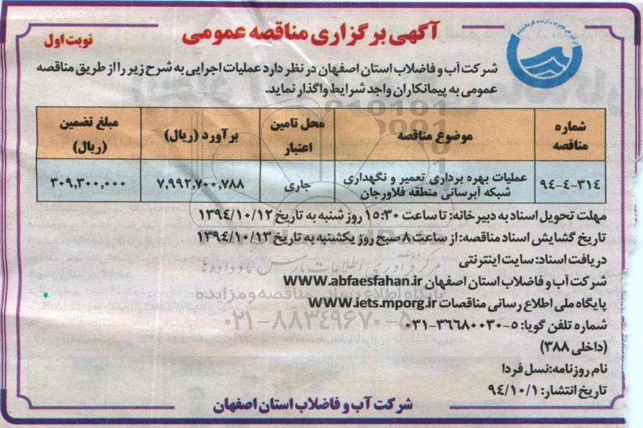 | 94-4-314 | عملیات بهره برداری ، تعمیر و نگهداری شبکه آبرسانی منطقه فلاورجان |