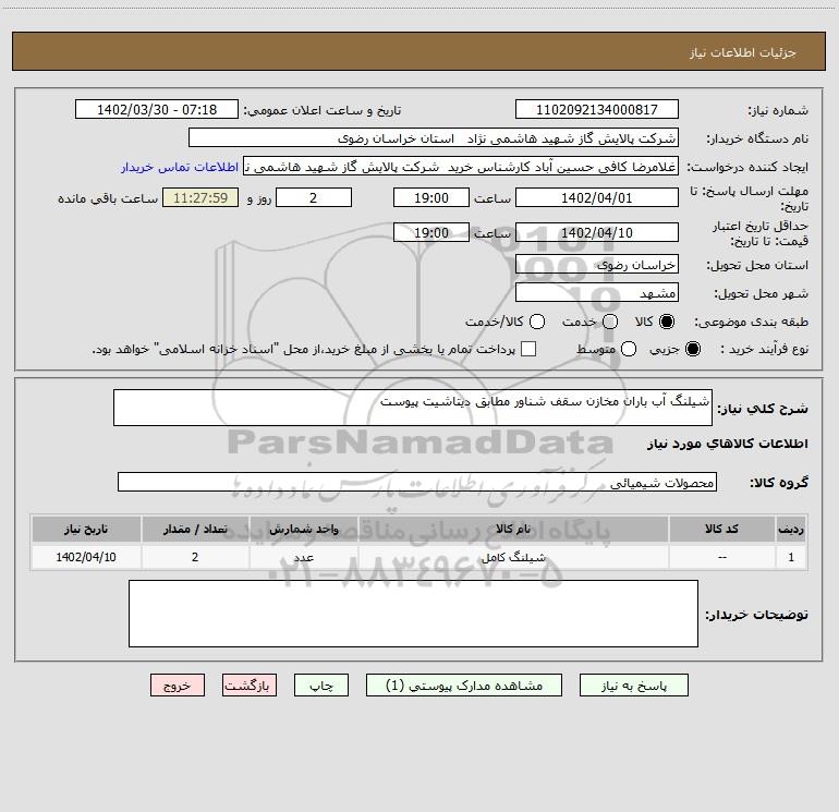 نام دستگاه خریدار:شرکت پالایش گاز شهید هاشمی نژاد استان خراسان رضوی