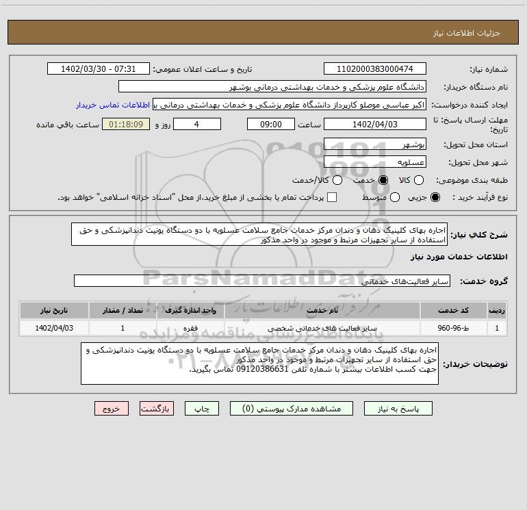 توضیحات خریدار:اجاره بهای کلینیک دهان و دندان مرکز خدمات جامع سلامت عسلویه با دو دستگاه یونیت دندانپزشکی و حق استفاده از سایر تجهیزات مرتبط و موجود در واحد مذکور