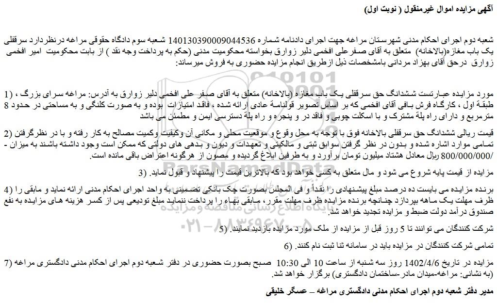 شعبه دوم اجرای احکام مدنی شهرستان مراغه جهت اجرای دادنامه شماره 140130390009044536 شعبه سوم دادگاه حقوقی مراغه درنظردارد سرقفلی یک باب مغازه(بالاخانه) متعلق به آقای صفرعلی افخمی دلیر زوارق بخواسته محکومیت مدنی (حکم به پرداخت وجه نقد ) از بابت محکومیت امیر افخمی زوارق درحق آقای بهزاد مردانی بامشخصات ذیل ازطریق انجام مزایده حضوری به فروش میرساند:
