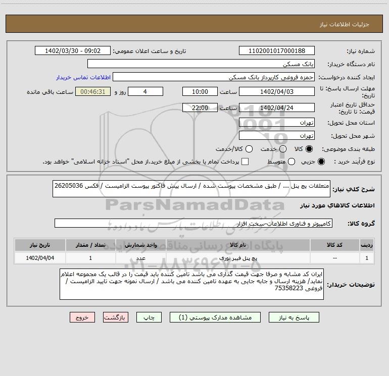 شرح کلی نیاز: متعلقات پچ پنل ... / طبق مشخصات پیوست شده / ارسال پیش فاکتور پیوست الزامیست / فکس 26205036