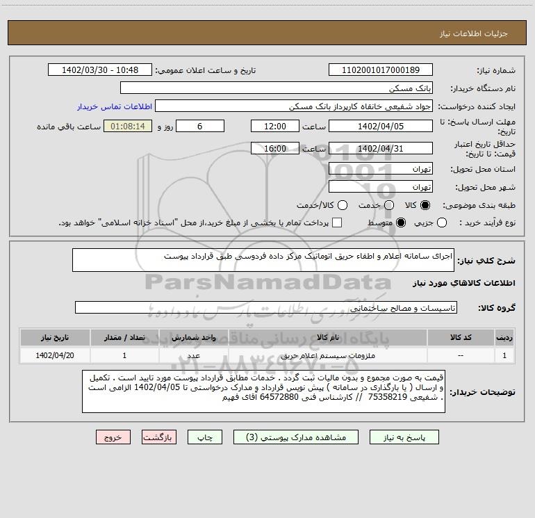 شرح کلی نیاز: اجرای سامانه اعلام و اطفاء حریق اتوماتیک مرکز داده فردوسی طبق قرارداد پیوست