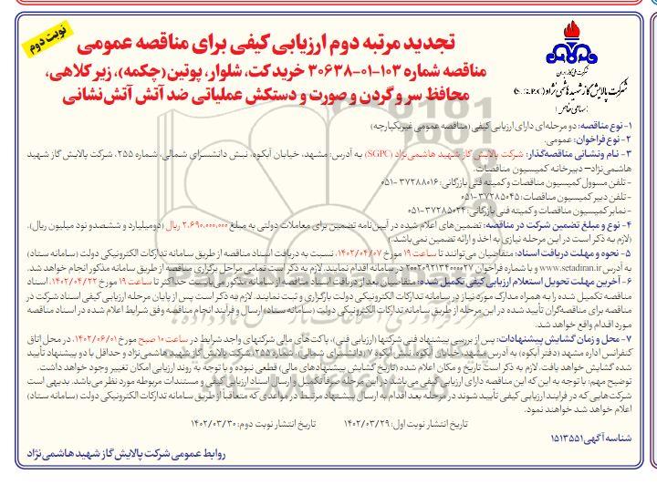 تجدید مناقصه خرید کت، شلوار، پوتین (چکمه)، زیرکلاهی، محافظ سر و گردن و صورت... .مرتبه دوم نوبت دوم ؟