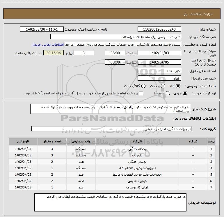 شرح کلی نیاز: یخچال.تلویزیون.مایکرویو.تخت خواب.فرش.اجاق صفحه ای.(طبق شرح ومشخصات پیوست بارگذاری شده درسامانه )