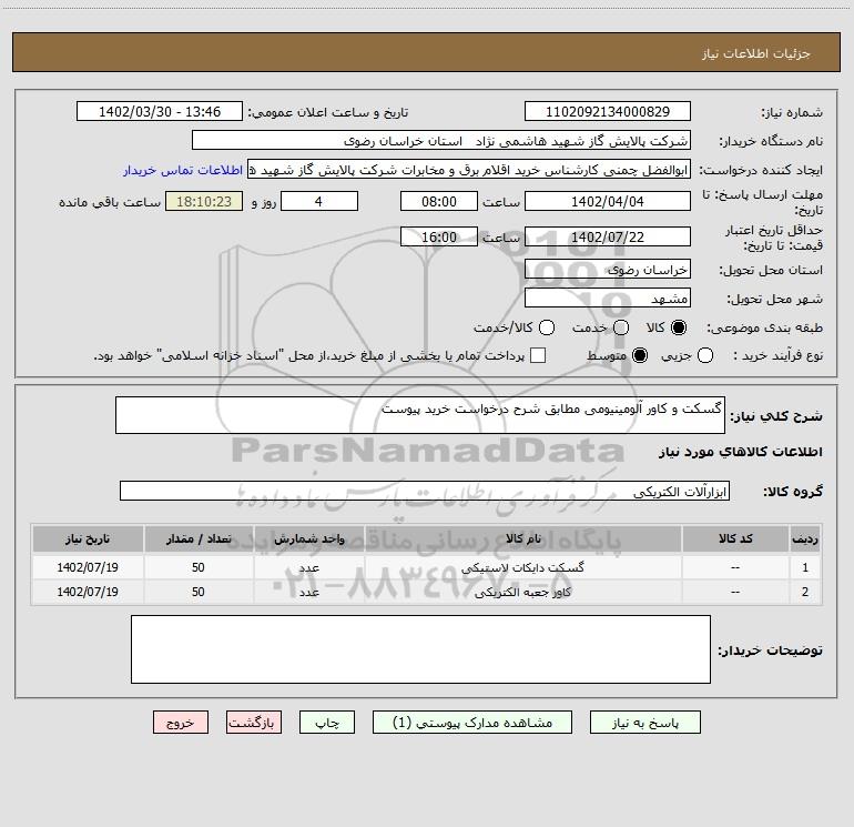 شرح کلی نیاز: گسکت و کاور آلومینیومی مطابق شرح درخواست خرید پیوست
