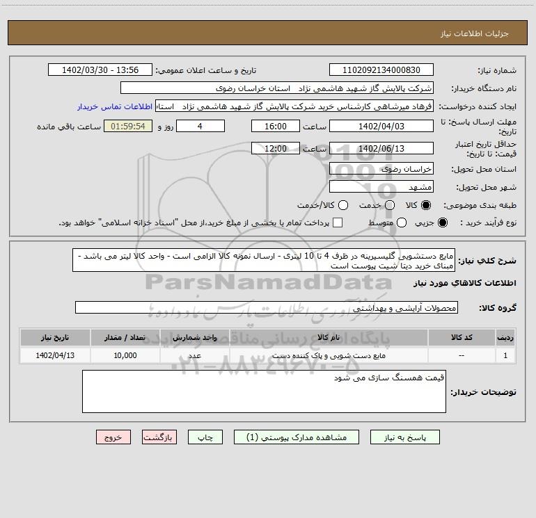 شرح کلی نیاز: مایع دستشویی گلیسیرینه در ظرف 4 تا 10 لیتری - ارسال نمونه کالا الزامی است - واحد کالا لیتر می باشد - مبنای خرید دیتا شیت پیوست است
