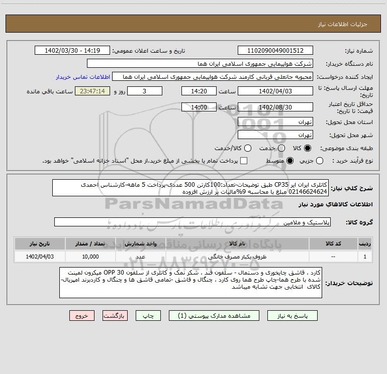 شرح کلی نیاز: کاتلری ایران ایر CP35 طبق توضیحات-تعداد:100کارتن 500 عددی-پرداخت 5 ماهه-کارشناس احمدی 02146624624 مبلغ با محاسبه 9%مالیات بر ارزش افزوده