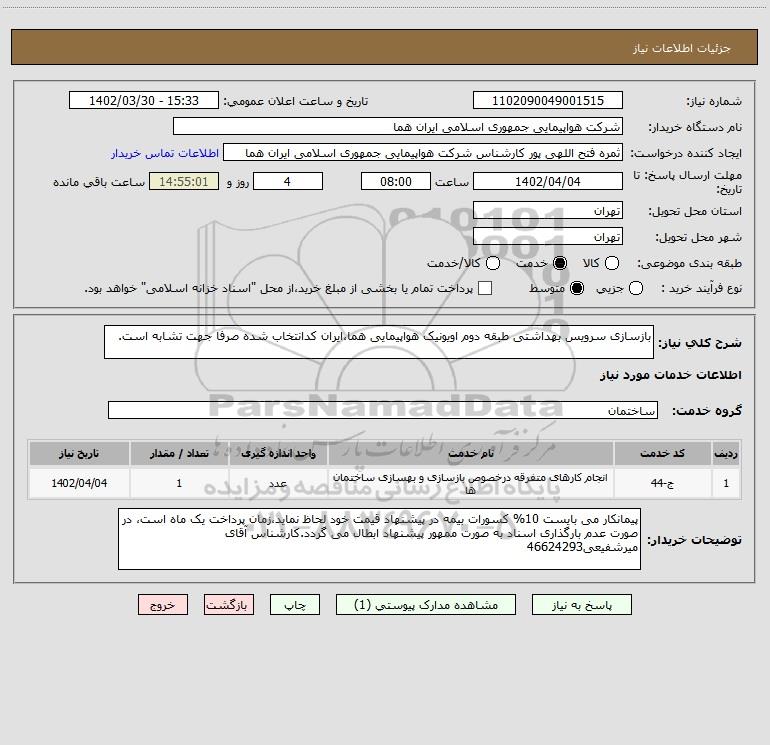 شرح کلی نیاز: بازسازی سرویس بهداشتی طبقه دوم اویونیک هواپیمایی هما،ایران کدانتخاب شده صرفا جهت تشابه است.