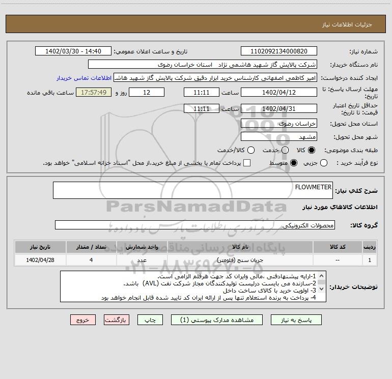 نام دستگاه خریدار:شرکت پالایش گاز شهید هاشمی نژاد استان خراسان رضوی