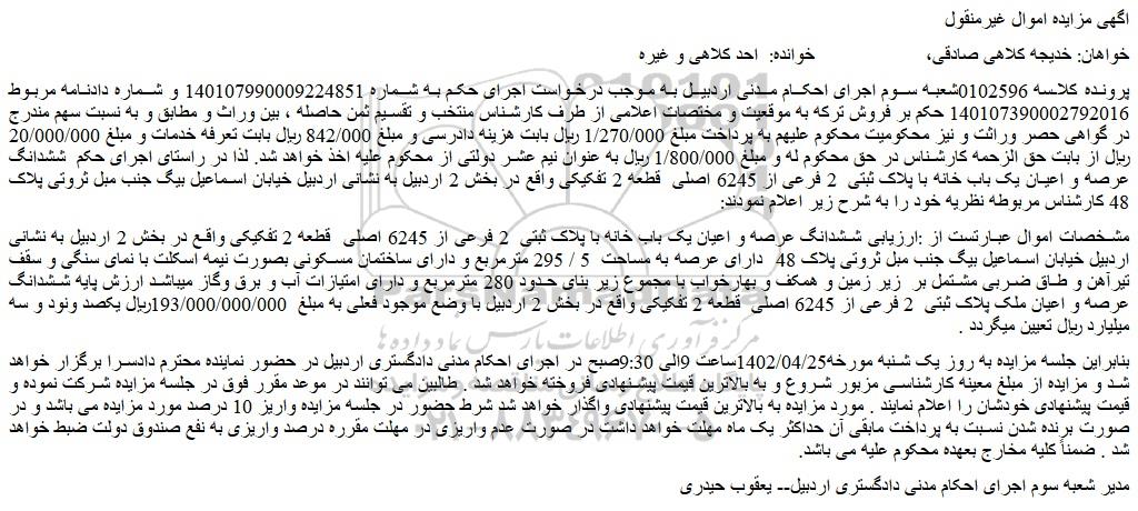 پرونده کلاسه 0102596شعبه سوم اجرای احکام مدنی اردبیل به موجب درخواست اجرای حکم به شماره 140107990009224851 و شماره دادنامه مربوط 140107390002792016 حکم بر فروش ترکه به موقعیت و مختصات اعلامی از طرف کارشناس منتخب و تقسیم ثمن حاصله ، بین وراث و مطابق و به نسبت سهم مندرج در گواهی حصر وراثت و نیز محکومیت محکوم علیهم به پرداخت مبلغ 1/270/000 ریال بابت هزینه دادرسی و مبلغ 842/000 ریال بابت تعرفه خدمات و مبلغ 20/000/000 ریال از بابت حق الزحمه کارشناس در حق محکوم له و مبلغ 1/800/000 ریال به عنوان نیم عشر دولتی از محکوم علیه اخذ خواهد شد. لذا در راستای اجرای حکم ششدانگ عرصه و اعیان یک باب خانه با پلاک ثبتی 2 فرعی از 6245 اصلی قطعه 2 تفکیکی واقع در بخش 2 اردبیل به نشانی اردبیل خیابان اسماعیل بیگ جنب مبل ثروتی پلاک 48 کارشناس مربوطه نظریه خود را به شرح زیر اعلام نمودند: