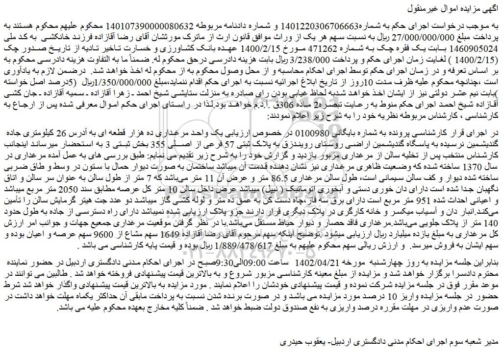 به موجب درخواست اجرای حکم به شماره1401220306706663 و شماره دادنامه مربوطه 140107390000080632 محکوم علیهم محکوم هستند به پرداخت مبلغ 27/000/000/000 ریال به نسبت سهم هر یک از وراث موافق قانون ارث از ماترک مورثشان آقای رضا آقازاده فرزند خانکشی  به کد ملی 1460905024 بابت یک فقره چک به شماره 471262 مورخ 1400/2/15 عهده بانک کشاورزی و خسارت تاخیر تادیه از تاریخ صدور چک (1400/2/15 ) لغایت زمان اجرای حکم و پرداخت 3/238/000 ریال بابت هزینه دادرسی درحق محکوم له. ضمناً ما به التفاوت هزینه دادرسی محکوم به بر اساس تعرفه و در زمان اجرای حکم توسط اجرای احکام محاسبه و از محل وصول محکوم به از محکوم له اخذ خواهد شد.  درضمن لازم به یادآوری است ،چنانچه محکوم علیه ظرف مدت 10روز از تاریخ ابلاغ اجرائیه نسبت به اجرای حکم اقدام ننماید،مبلغ 1/350/000/000ریال  (5درصد اصل خواسته )بابت نیم عشر دولتی نیز از ایشان اخذ خواهد شدبه لحاظ غیابی بودن رای صادره به منزلت ستایشی شیخ احمد ـ زهرا آقازاده ـ سمیه آقازاده ـ جان کشی آقازاده شیخ احمد اجرای حکم منوط به رعایت تبصره2 ماده 306ق .آ.د.م خواهد بود.لذا در راستای اجرای حکم اموال معرفی شده پس از ارجاع به کارشناسی ، کارشناس مربوطه نظریه خود را به شرح زیر اعلام نمودند: