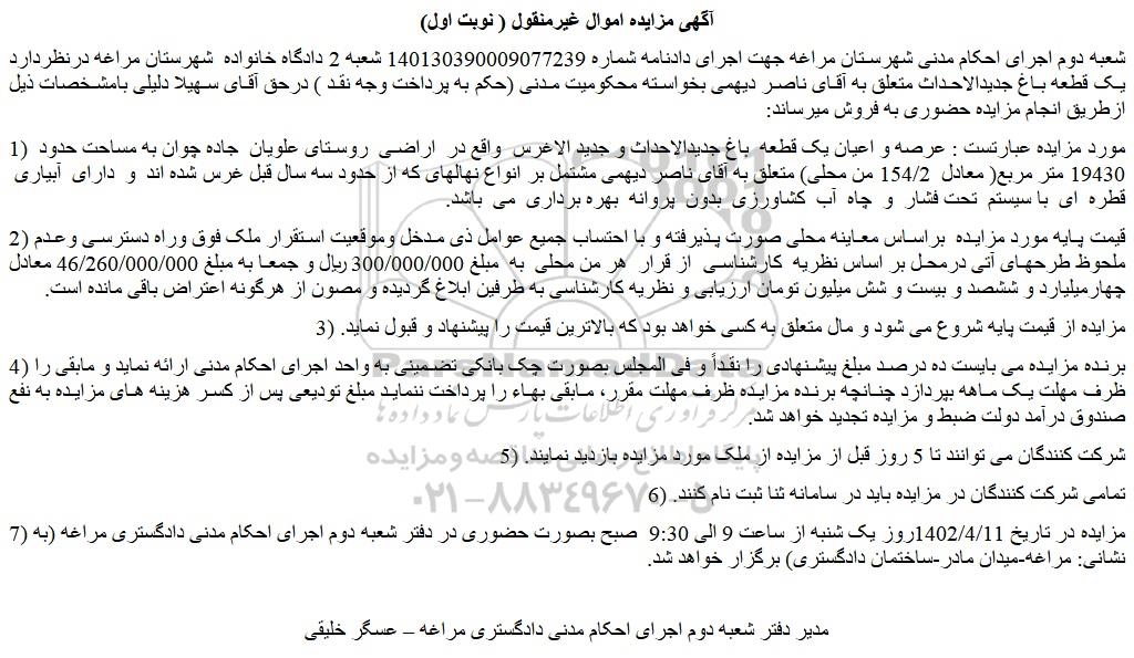 شعبه دوم اجرای احکام مدنی شهرستان مراغه جهت اجرای دادنامه شماره 140130390009077239 شعبه 2 دادگاه خانواده شهرستان مراغه درنظردارد یک قطعه باغ جدیدالاحداث متعلق به آقای ناصر دیهمی بخواسته محکومیت مدنی (حکم به پرداخت وجه نقد ) درحق آقای سهیلا دلیلی بامشخصات ذیل ازطریق انجام مزایده حضوری به فروش میرساند:
