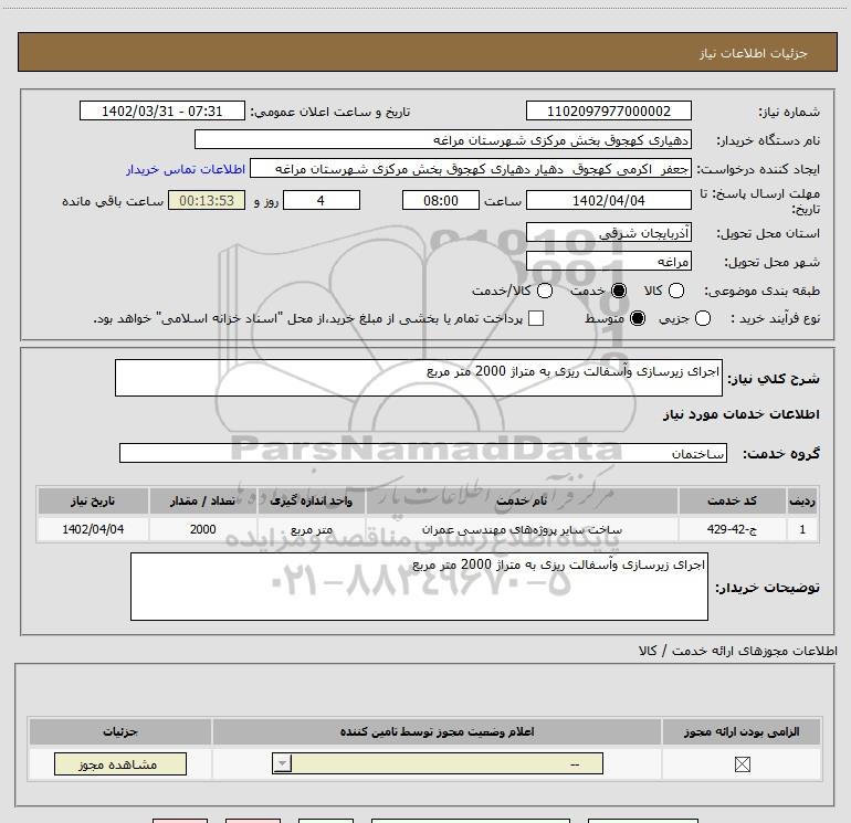 شرح کلی نیاز: اجرای زیرسازی وآسفالت ریزی به متراژ 2000 متر مربع