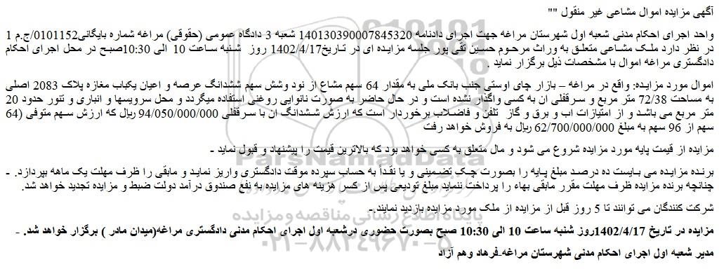 "آگهی مزایده اموال مشاعی غیر منقول "