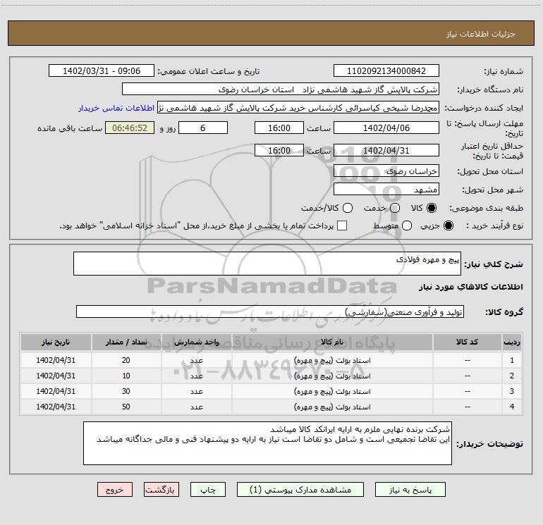 نام دستگاه خریدار:شرکت پالایش گاز شهید هاشمی نژاد استان خراسان رضوی